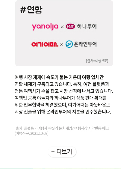#연합여행 시장 재개에 속도가 붙는 가운데 여행 업체간 연합 체제가 구축되고 있습니다. 특히, 여행 플랫폼과 전통 여행사가 손을 잡고 시장 선점에 나서고 있습니다. 여행업 공룡 야놀자와 하나투어가 상품 판매 확대를 위한 업무협약을 체결했으며, 여기어때는 아웃바운드 시장 진출을 위해 온라인투어의 지분을 인수했습니다. - [출처] 플랫폼‧여행사 짝짓기 눈치게임? 여행시장 지각변동 예고 (여행신문, 2021.10.08)