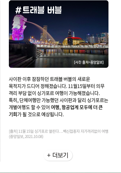 #트래블 버블사이판 이후 잠잠하던 트래블 버블의 새로운 목적지가 드디어 정해졌습니다. 11월15일부터 의무 격리 부담 없이 싱가포르 여행이 가능해졌습니다. 특히, 단체여행만 가능했던 사이판과 달리 싱가포르는 개별여행도 할 수 있어 여행, 항공업계 모두에 더 큰 기회가 될 것으로 예상됩니다. - [출처] 11월 15일 싱가포르 열린다…백신접종자 자가격리없이 여행 (중앙일보, 2021.10.08) ![]()