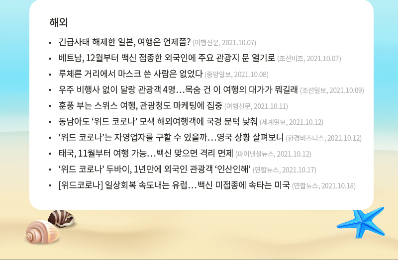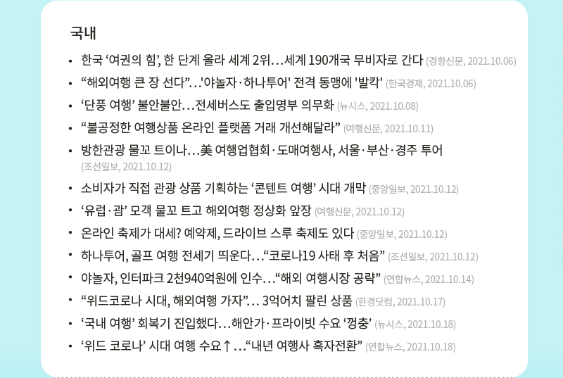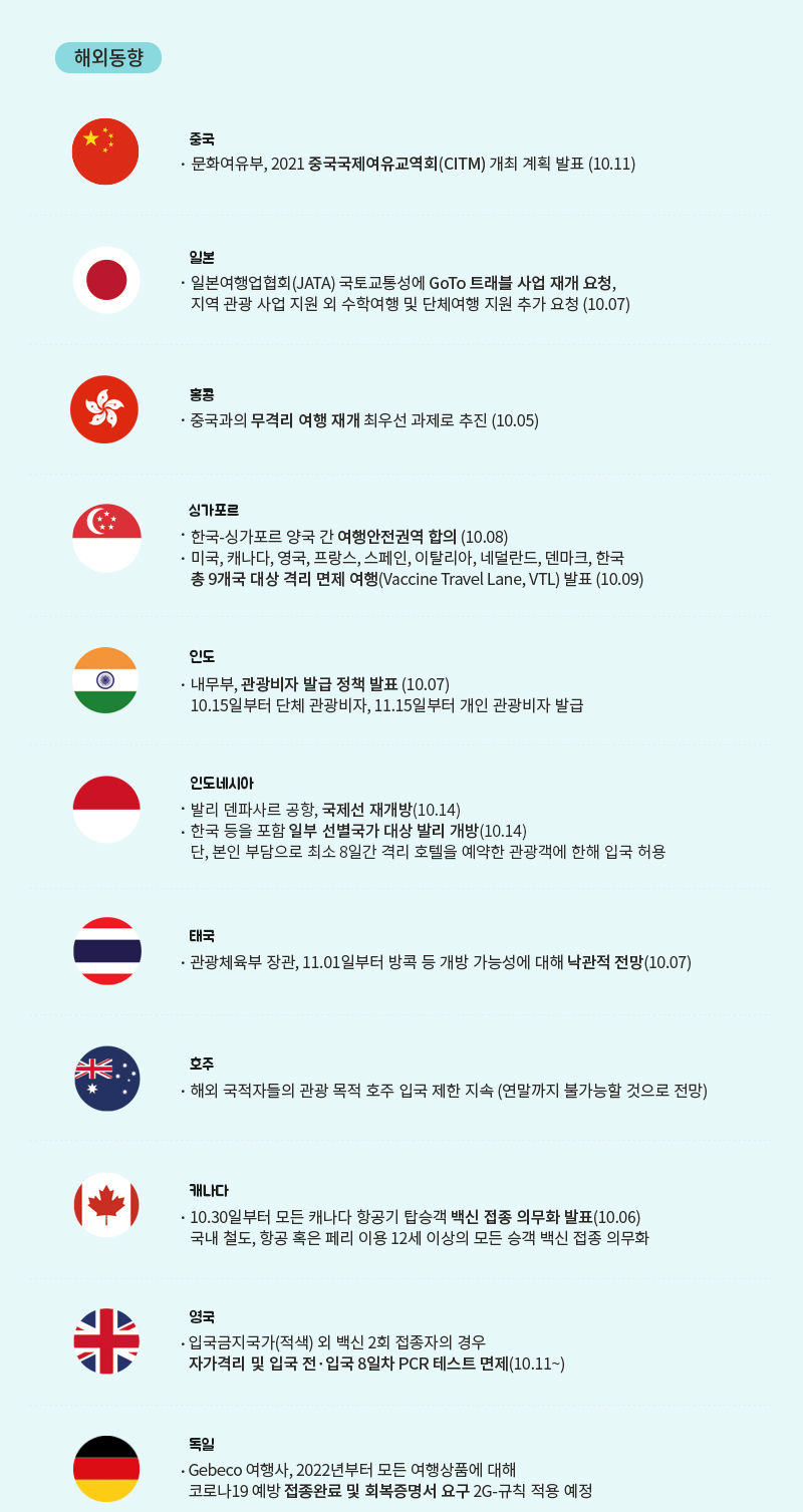 해외동향 중국- 문화여유부, 2021 중국국제여유교역회(CITM) 개최 계획 발표 (10.11)일본- 일본여행업협회(JATA) 국토교통성에 GoTo 트래블 사업 재개 요청, 지역 관광 사업 지원 외 수학여행 및 단체여행 지원 추가 요청 (10.07)홍콩- 중국과의 무격리 여행 재개 최우선 과제로 추진 (10.05)싱가포르- 한국-싱가포르 양국 간 여행안전권역 합의 (10.08)- 미국, 캐나다, 영국, 프랑스, 스페인, 이탈리아, 네덜란드, 덴마크, 한국 총 9개국 대상 격리 면제 여행(Vaccine Travel Lane, VTL) 발표 (10.09)인도- 내무부, 관광비자 발급 정책 발표 (10.07) 10.15일부터 단체 관광비자, 11.15일부터 개인 관광비자 발급인도네시아- 발리 덴파사르 공항, 국제선 재개방(10.14)- 한국 등을 포함 일부 선별국가 대상 발리 개방(10.14) 단, 본인 부담으로 최소 8일간 격리 호텔을 예약한 관광객에 한해 입국 허용태국- 관광체육부 장관, 11.01일부터 방콕 등 개방 가능성에 대해 낙관적 전망(10.07)호주- 해외 국적자들의 관광 목적 호주 입국 제한 지속 (연말까지 불가능할 것으로 전망)캐나다- 10.30일부터 모든 캐나다 항공기 탑승객 백신 접종 의무화 발표(10.06) 국내 철도, 항공 혹은 페리 이용 12세 이상의 모든 승객 백신 접종 의무화영국- 입국금지국가(적색) 외 백신 2회 접종자의 경우 자가격리 및 입국 전·입국 8일차 PCR 테스트 면제(10.11~)독일- Gebeco 여행사, 2022년부터 모든 여행상품에 대해 코로나19 예방 접종완료 및 회복증명서 요구 2G-규칙 적용 예정 ![]() |