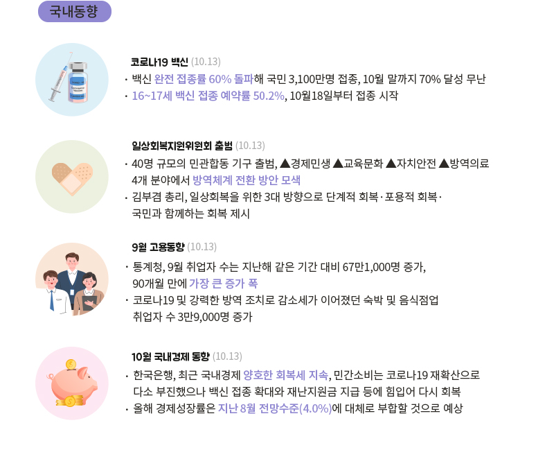 국내동향 코로나19 백신 (10.13) - 백신 완전 접종률 60% 돌파해 국민 3,100만명 접종, 10월 말까지 70% 달성 무난 - 16~17세 백신 접종 예약률 50.2%, 10월18일부터 접종 시작일상회복지원위원회 출범 (10.13)- 40명 규모의 민관합동 기구 출범, ▲경제민생 ▲교육문화 ▲자치안전 ▲방역의료 4개 분야에서 방역체계 전환 방안 모색- 김부겸 총리, 일상회복을 위한 3대 방향으로 단계적 회복·포용적 회복·국민과 함께하는 회복 제시9월 고용동향 (10.13)- 통계청, 9월 취업자 수는 지난해 같은 기간 대비 67만1,000명 증가, 90개월 만에 가장 큰 증가 폭- 코로나19 및 강력한 방역 조치로 감소세가 이어졌던 숙박 및 음식점업 취업자 수 3만9,000명 증가10월 국내경제 동향 (10.13)- 한국은행, 최근 국내경제 양호한 회복세 지속, 민간소비는 코로나19 재확산으로 다소 부진했으나 백신 접종 확대와 재난지원금 지급 등에 힘입어 다시 회복- 올해 경제성장률은 지난 8월 전망수준(4.0%)에 대체로 부합할 것으로 예상