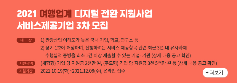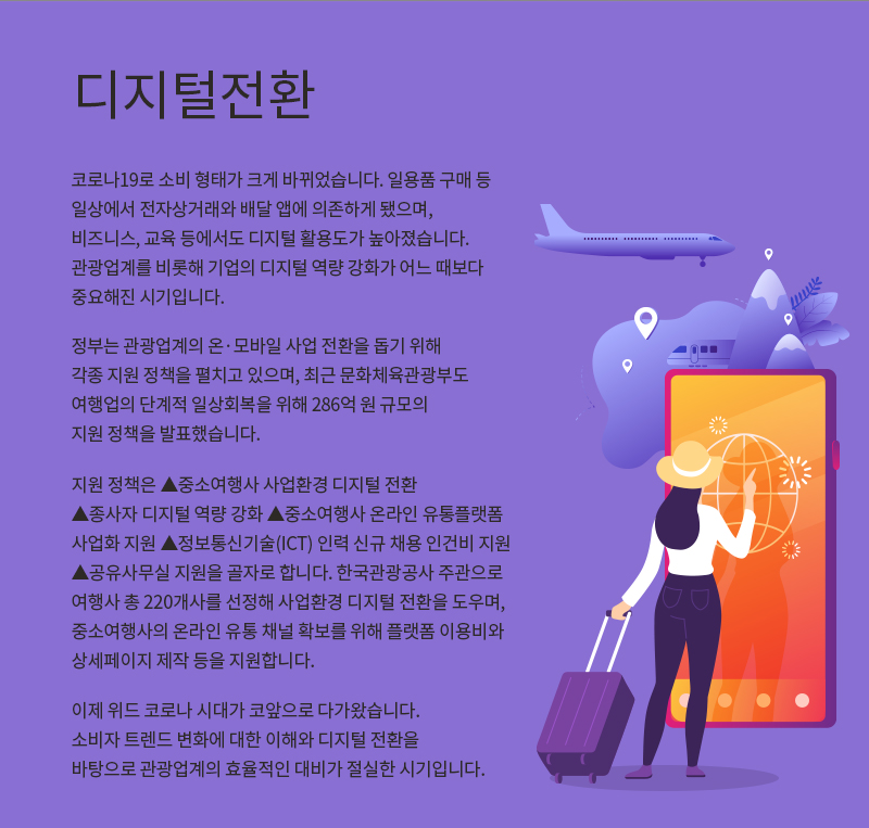 디지털전환 코로나19로 소비 형태가 크게 바뀌었습니다. 일용품 구매 등 일상에서 전자상거래와 배달 앱에 의존하게 됐으며, 비즈니스, 교육 등에서도 디지털 활용도가 높아졌습니다. 관광업계를 비롯해 기업의 디지털 역량 강화가 어느 때보다 중요해진 시기입니다. 정부는 관광업계의 온·모바일 사업 전환을 돕기 위해 각종 지원 정책을 펼치고 있으며, 최근 문화체육관광부도 여행업의 단계적 일상회복을 위해 286억 원 규모의 지원 정책을 발표했습니다. 지원 정책은 중소여행사 사업환경 디지털 전환 ▲종사자 디지털 역량 강화 ▲중소여행사 온라인 유통플랫폼 사업화 지원 ▲정보통신기술(ICT) 인력 신규 채용 인건비 지원 ▲공유사무실 지원을 골자로 합니다. 한국관광공사 주관으로 여행사 총 220개사를 선정해 사업환경 디지털 전환을 도우며, 중소여행사의 온라인 유통 채널 확보를 위해 플랫폼 이용비와 상세페이지 제작 등을 지원합니다. 이제 위드 코로나 시대가 코앞으로 다가왔습니다. 소비자 트렌드 변화에 대한 이해와 디지털 전환을 바탕으로 관광업계의 효율적인 대비가 절실한 시기입니다.