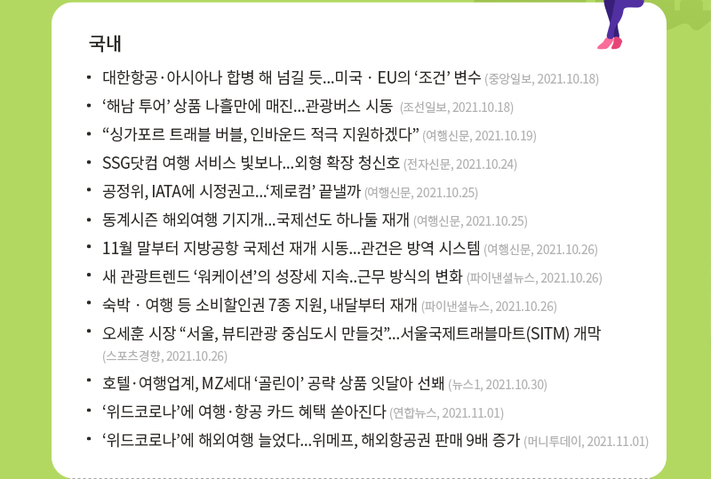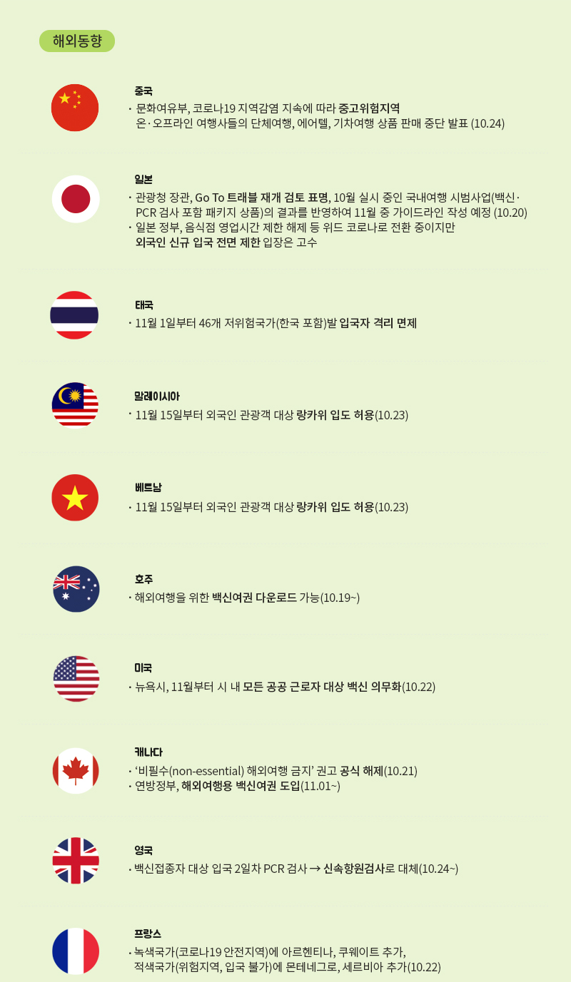 해외동향 중국- 문화여유부, 코로나19 지역감염 지속에 따라 중고위험지역 온·오프라인 여행사들의 단체여행, 에어텔, 기차여행 상품 판매 중단 발표 (10.24)일본- 관광청 장관, Go To 트래블 재개 검토 표명, 10월 실시 중인 국내여행 시범사업(백신·PCR 검사 포함 패키지 상품)의 결과를 반영하여 11월 중 가이드라인 작성 예정 (10.20)- 일본 정부, 음식점 영업시간 제한 해제 등 위드 코로나로 전환 중이지만 외국인 신규 입국 전면 제한 입장은 고수태국- 11월 1일부터 46개 저위험국가(한국 포함)발 입국자 격리 면제말레이시아- 11월 15일부터 외국인 관광객 대상 랑카위 입도 허용(10.23)베트남- 11월 15일부터 외국인 관광객 대상 랑카위 입도 허용(10.23)호주- 해외여행을 위한 백신여권 다운로드 가능(10.19~)미국- 뉴욕시, 11월부터 시 내 모든 공공 근로자 대상 백신 의무화(10.22)캐나다- ‘비필수(non-essential) 해외여행 금지’ 권고 공식 해제(10.21)- 연방정부, 해외여행용 백신여권 도입(11.01~)영국- 백신접종자 대상 입국 2일차 PCR 검사 → 신속항원검사로 대체(10.24~)프랑스- 녹색국가(코로나19 안전지역)에 아르헨티나, 쿠웨이트 추가, 적색국가(위험지역, 입국 불가)에 몬테네그로, 세르비아 추가(10.22) ![]() |