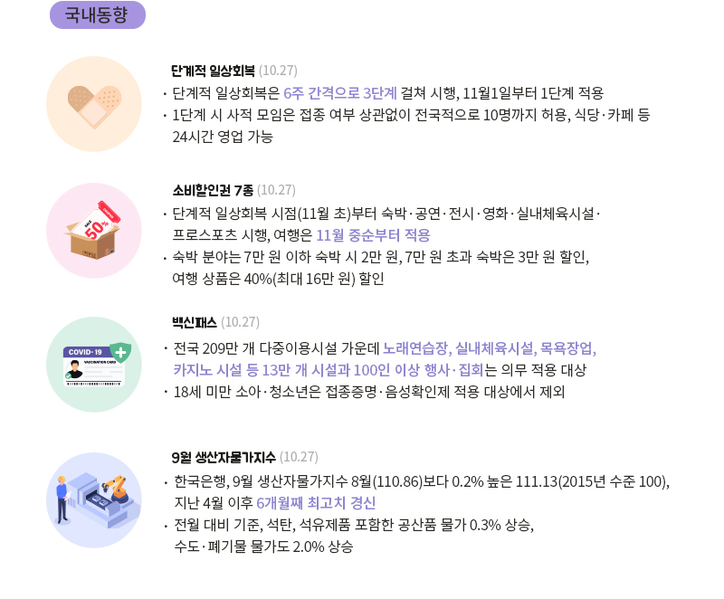국내동향 단계적 일상회복 (10.27) - 단계적 일상회복은 6주 간격으로 3단계 걸쳐 시행, 11월1일부터 1단계 적용 - 1단계 시 사적 모임은 접종 여부 상관없이 전국적으로 10명까지 허용, 식당·카페 등 24시간 영업 가능소비할인권 7종 (10.27)- 단계적 일상회복 시점(11월 초)부터 숙박·공연·전시·영화·실내체육시설·프로스포츠 시행, 여행은 11월 중순부터 적용- 숙박 분야는 7만 원 이하 숙박 시 2만 원, 7만 원 초과 숙박은 3만 원 할인, 여행 상품은 40%(최대 16만 원) 할인백신패스 (10.27)- 전국 209만 개 다중이용시설 가운데 노래연습장, 실내체육시설, 목욕장업, 카지노 시설 등 13만 개 시설과 100인 이상 행사·집회는 의무 적용 대상- 18세 미만 소아·청소년은 접종증명·음성확인제 적용 대상에서 제외9월 생산자물가지수 (10.27)- 한국은행, 9월 생산자물가지수 8월(110.86)보다 0.2% 높은 111.13(2015년 수준 100), 지난 4월 이후 6개월째 최고치 경신- 전월 대비 기준, 석탄, 석유제품 포함한 공산품 물가 0.3% 상승, 수도·폐기물 물가도 2.0% 상승