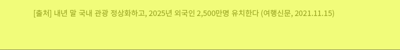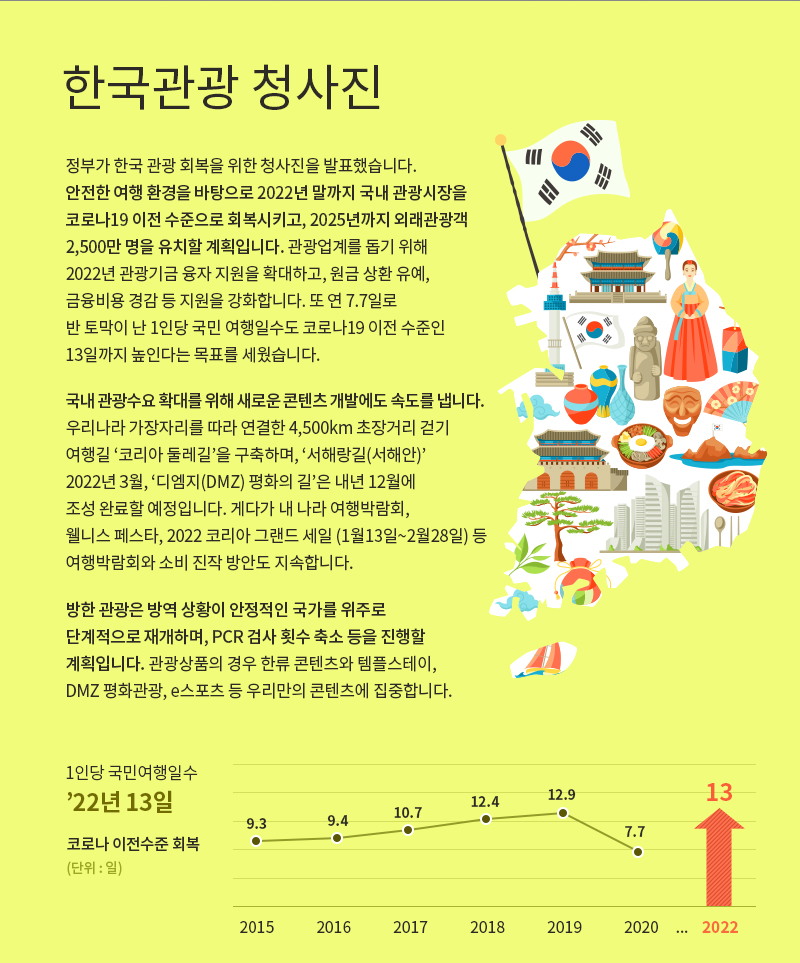 한국관광 청사진 정부가 한국 관광 회복을 위한 청사진을 발표했습니다. 안전한 여행 환경을 바탕으로 2022년 말까지 국내 관광시장을 코로나19 이전 수준으로 회복시키고, 2025년까지 외래관광객 2,500만 명을 유치할 계획입니다. 관광업계를 돕기 위해 2022년 관광기금 융자 지원을 확대하고, 원금 상환 유예, 금융비용 경감 등 지원을 강화합니다. 또 연 7.7일로 반 토막이 난 1인당 국민 여행일수도 코로나19 이전 수준인 13일까지 높인다는 목표를 세웠습니다. 국내 관광수요 확대를 위해 새로운 콘텐츠 개발에도 속도를 냅니다. 우리나라 가장자리를 따라 연결한 4,500km 초장거리 걷기 여행길 ‘코리아 둘레길’을 구축하며, ‘서해랑길(서해안)’ 2022년 3월, ‘디엠지(DMZ) 평화의 길’은 내년 12월에 조성 완료할 예정입니다. 게다가 내 나라 여행박람회, 웰니스 페스타, 2022 코리아 그랜드 세일 (1월13일~2월28일) 등 여행박람회와 소비 진작 방안도 지속합니다. 방한 관광은 방역 상황이 안정적인 국가를 위주로 단계적으로 재개하며, PCR 검사 횟수 축소 등을 진행할 계획입니다. 관광상품의 경우 한류 콘텐츠와 템플스테이, DMZ 평화관광, e스포츠 등 우리만의 콘텐츠에 집중합니다. 1인당 국민여행일수 ’22년 13일 코로나 이전수준 회복 (단위 : 일), 2015 = 9.3, 2016 = 9.4, 2017 = 10.7, 2018 = 12.4, 2019 = 12.9, 2020 = 7.7, ··· 2020 = 13