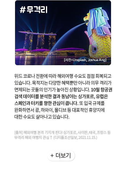 #무격리위드 코로나 전환에 따라 해외여행 수요도 점점 회복되고 있습니다. 목적지는 다양한 혜택뿐만 아니라 의무 격리가 면제되는 곳들의 인기가 높아진 상황입니다. 10월 항공권 검색 데이터를 분석한 결과 동남아는 싱가포르, 유럽은 스페인과 터키를 향한 관심이 큽니다. 또 입국 규제를 완화하면서 괌, 하와이, 몰디브 등 대표적인 휴양지에 대한 수요도 살아나고 있습니다.