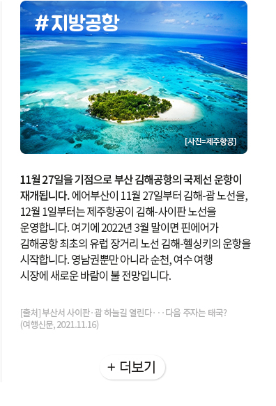 #지방공항11월 27일을 기점으로 부산 김해공항의 국제선 운항이 재개됩니다. 에어부산이 11월 27일부터 김해-괌 노선을, 12월 1일부터는 제주항공이 김해-사이판 노선을 운영합니다. 여기에 2022년 3월 말이면 핀에어가 김해공항 최초의 유럽 장거리 노선 김해-헬싱키의 운항을 시작합니다. 영남권뿐만 아니라 순천, 여수 여행 시장에 새로운 바람이 불 전망입니다. ![]()