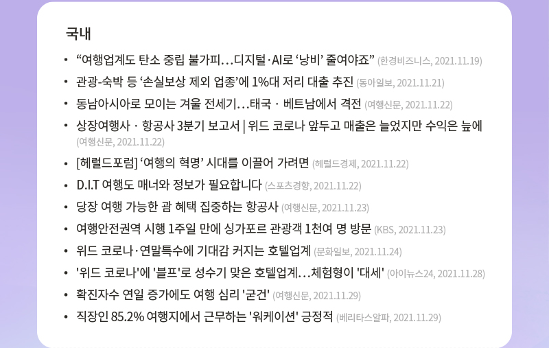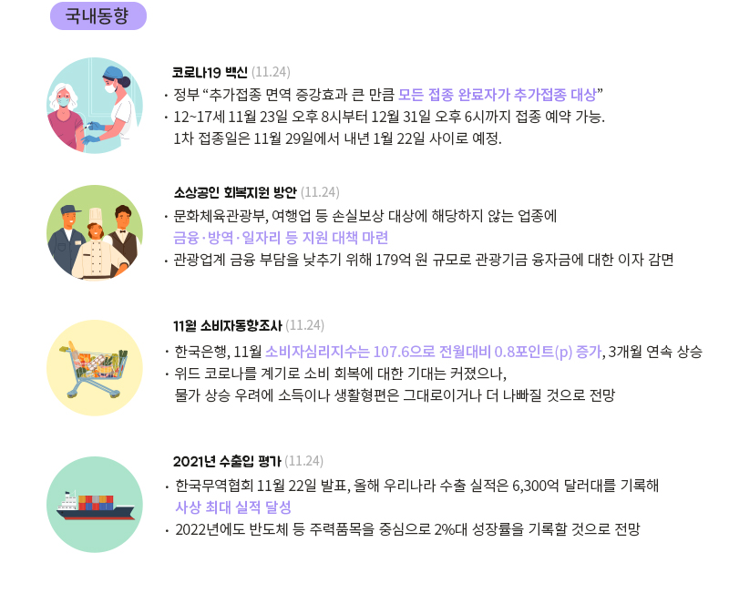 국내동향 코로나19 백신 (11.24) - 정부 “추가접종 면역 증강효과 큰 만큼 모든 접종 완료자가 추가접종 대상”- 12~17세 11월 23일 오후 8시부터 12월 31일 오후 6시까지 접종 예약 가능. 1차 접종일은 11월 29일에서 내년 1월 22일 사이로 예정.소상공인 회복지원 방안 (11.24)- 문화체육관광부, 여행업 등 손실보상 대상에 해당하지 않는 업종에 금융·방역·일자리 등 지원 대책 마련- 관광업계 금융 부담을 낮추기 위해 179억 원 규모로 관광기금 융자금에 대한 이자 감면11월 소비자동향조사 (11.24)- 한국은행, 11월 소비자심리지수는 107.6으로 전월대비 0.8포인트(p) 증가, 3개월 연속 상승 위드 코로나를 계기로 소비 회복에 대한 기대는 커졌으나,물가 상승 우려에 소득이나 생활형편은 그대로이거나 더 나빠질 것으로 전망2021년 수출입 평가 (11.24)- 한국무역협회 11월 22일 발표, 올해 우리나라 수출 실적은 6,300억 달러대를 기록해 사상 최대 실적 달성- 2022년에도 반도체 등 주력품목을 중심으로 2%대 성장률을 기록할 것으로 전망