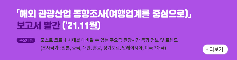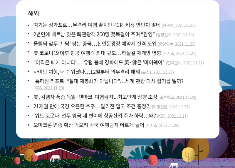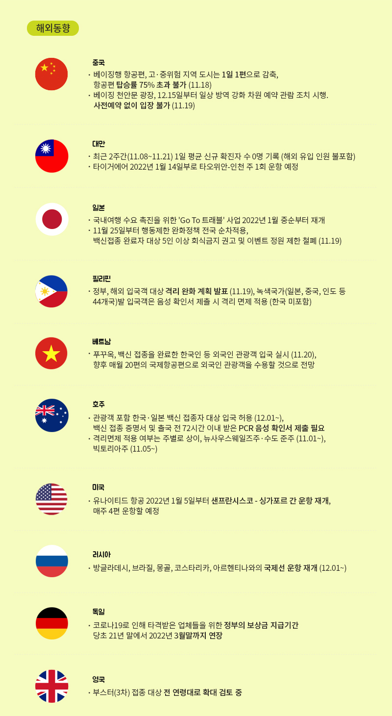 해외동향 중국- 베이징행 항공편, 고·중위험 지역 도시는 1일 1편으로 감축, 항공편 탑승률 75% 초과 불가 (11.18)- 베이징 천안문 광장, 12.15일부터 일상 방역 강화 차원 예약 관람 조치 시행. 사전예약 없이 입장 불가 (11.19)대만- 최근 2주간(11.08~11.21) 1일 평균 신규 확진자 수 0명 기록 (해외 유입 인원 불포함)- 타이거에어 2022년 1월 14일부로 타오위안-인천 주 1회 운항 예정일본- 국내여행 수요 촉진을 위한 'Go To 트래블' 사업 2022년 1월 중순부터 재개- 11월 25일부터 행동제한 완화정책 전국 순차적용, 백신접종 완료자 대상 5인 이상 회식금지 권고 및 이벤트 정원 제한 철폐 (11.19)필리핀- 정부, 해외 입국객 대상 격리 완화 계획 발표 (11.19), 녹색국가(일본, 중국, 인도 등 44개국)발 입국객은 음성 확인서 제출 시 격리 면제 적용 (한국 미포함)베트남- 푸꾸옥, 백신 접종을 완료한 한국인 등 외국인 관광객 입국 실시 (11.20), 향후 매월 20편의 국제항공편으로 외국인 관광객을 수용할 것으로 전망호주- 관광객 포함 한국·일본 백신 접종자 대상 입국 허용 (12.01~), 백신 접종 증명서 및 출국 전 72시간 이내 받은 PCR 음성 확인서 제출 필요- 격리면제 적용 여부는 주별로 상이, 뉴사우스웨일즈주·수도 준주 (11.01~), 빅토리아주 (11.05~)미국- 유나이티드 항공 2022년 1월 5일부터 샌프란시스코 - 싱가포르 간 운항 재개, 매주 4편 운항할 예정러시아- 방글라데시, 브라질, 몽골, 코스타리카, 아르헨티나와의 국제선 운항 재개 (12.01~)독일- 코로나19로 인해 타격받은 업체들을 위한 정부의 보상금 지급기간 당초 21년 말에서 2022년 3월말까지 연장영국- 부스터(3차) 접종 대상 전 연령대로 확대 검토 중 ![]() |